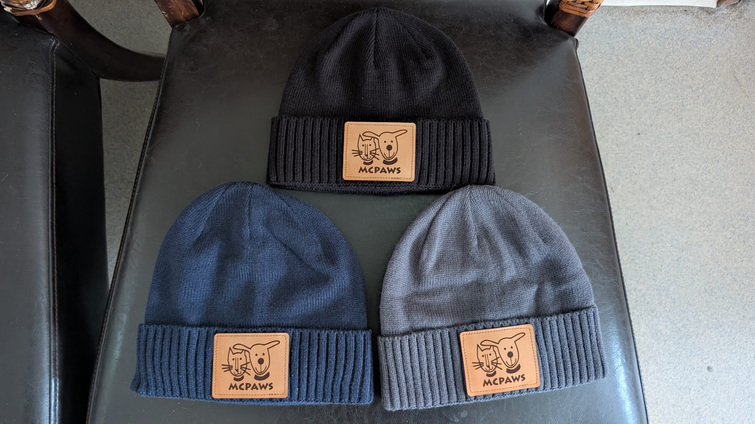 Check out our canvas adjustable baseball hats that are comfortable and look great on everyone. You can get yours in denim blue or moss green (the green looks darker in the photos). Or you can cozy up in your MCPAWS beanie! Now available in navy blue, charcoal grey, and black while supplies last.